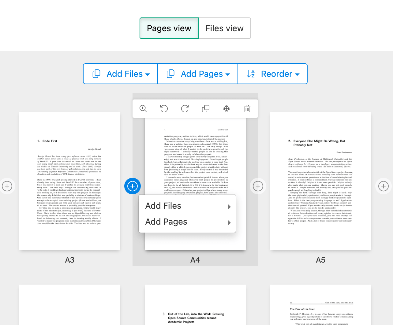 In the Pages view you can also delete pages, reorder them, or duplicate them before merging.